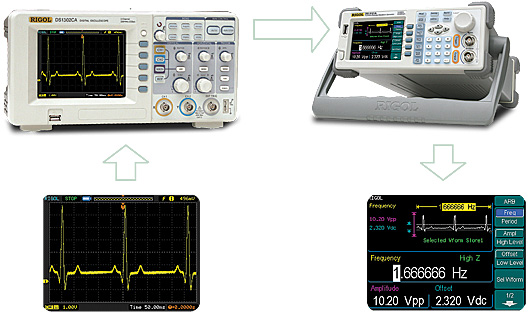 DS1000CA與RIGOL DG系列函數(shù)/任意波形發(fā)生器可以實現(xiàn)無縫互連。通過USB接口,DG系列函數(shù)/任意波形發(fā)生器可以直接訪問DS1000CA的波形內(nèi)存,并再現(xiàn)波形,方便對瞬態(tài)信號的進一步研究。