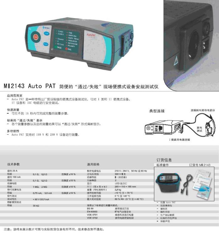 - 關(guān)鍵參數(shù):MI2143現(xiàn)場(chǎng)便攜式設(shè)備安規(guī)測(cè)試儀,應(yīng)用范圍寬,可對(duì)I類和II便攜式設(shè)備、IT設(shè)備和IEC電纜進(jìn)行安全測(cè)試??稍诓坏?15 秒內(nèi)可完成完整的測(cè)量步驟,各個(gè)測(cè)量參數(shù)以及總的測(cè)量結(jié)果可以“通過 / 失敗”形式清晰顯示。支持對(duì) 110 V 和 230 V 設(shè)備進(jìn)行測(cè)量。