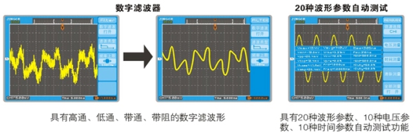 ▲多種自動測量功能Vpp,Vamp,Vrms,Vmax,Vmin,Vtop,Vbase,Vavg,Freq,Period,Risetime,Falltime, +Width,-Width,Overshoot,Preshoot,+Duty,-Duty,etc.