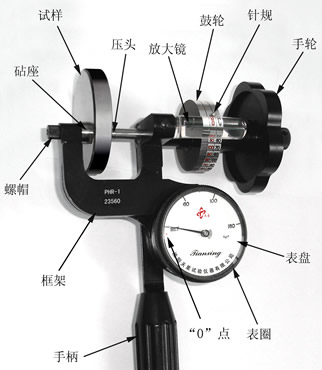 本儀器的設計符合洛氏硬度試驗的基本定義。與臺式機的主要不同點是:其試驗力的施加是通過螺桿和一個已校準的彈簧完成的;用刻度表測量彈簧位移來確定試驗力的大小;壓痕深度的測量由精密螺旋測微機構完成,硬度值的讀取方式是透過放大鏡讀取鼓輪上的刻度線。本儀器的結構如上圖所示